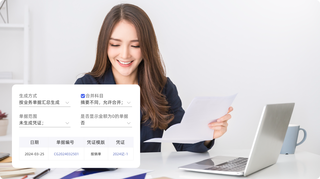 财务凭证一键生成,支持按组织架构、部门、职员、供应商等多维度核算项目。一键生成日记账,自动生成付款类单据,减少财务工作量,构建业财税费的一体化业态