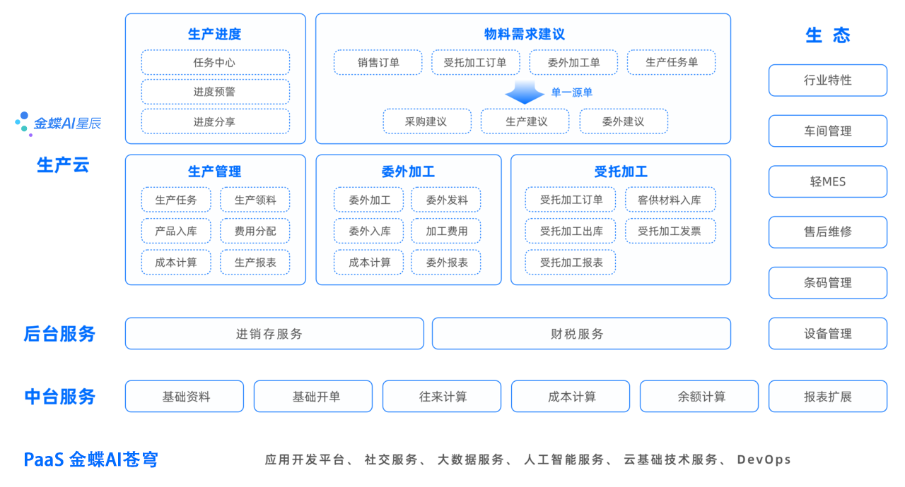 金è¶AI星辰生产云é¢å‘å°åž‹å·¥è´¸ä¼ä¸šçš„生产ã€ä»“库ã€è´¢åŠ¡ã€é‡‡è´ç‰ç®¡ç†äººå‘˜ï¼Œæä¾›ä»¥é”€å”®è®¢å•为æºå¤´çš„全业务æµç¨‹çš„æ•°å—化管控。支æŒä»Žé”€å”®ç®¡ç†ã€é‡‡è´ç®¡ç†ã€ç”Ÿäº§ç®¡ç†ã€å§”外管ç†ã€åº“å˜ç®¡ç†å’Œè´¢åŠ¡ç®¡ç†å¸®åŠ©å°åž‹å·¥è´¸ä¼ä¸šæœ‰æ•ˆåœ°æŽŒæ¡å„个环节的活动信æ¯ï¼ŒæŽŒæ¡ç”Ÿäº§è¿›åº¦ï¼Œæé«˜ç”Ÿäº§æ•ˆçŽ‡ï¼Œé™ä½Žææ–™æŸè€—å’Œç”Ÿäº§æˆæœ¬ï¼Œç»¼åˆæå‡äº§å“交付率,使得客户对ä¼ä¸šæœ‰æ›´é«˜çš„æ»¡æ„度