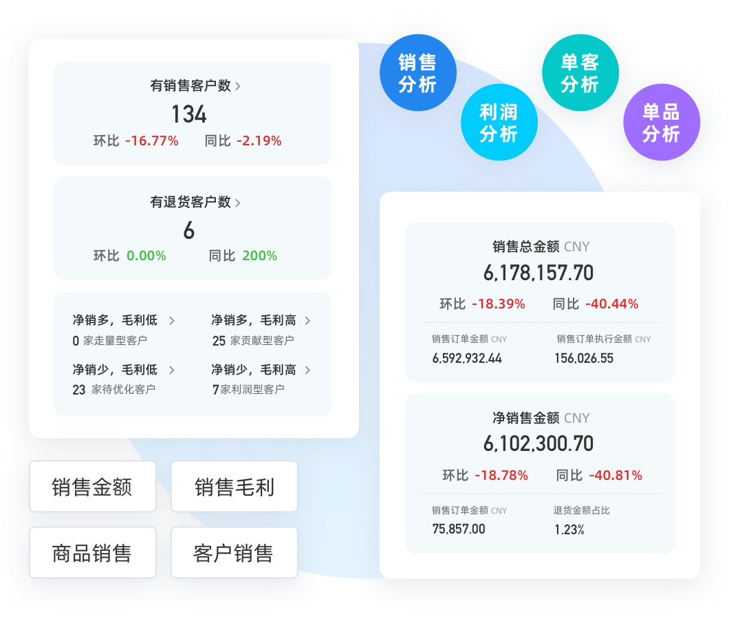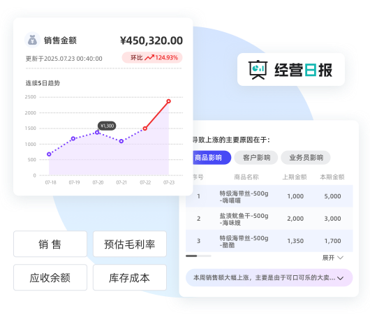 日、周、月多时间维度展示销售、利润变化趋势,关键经营数据一手掌控;从商品、业务员、客户等维度分析业绩变化原因,环比变化清晰明了