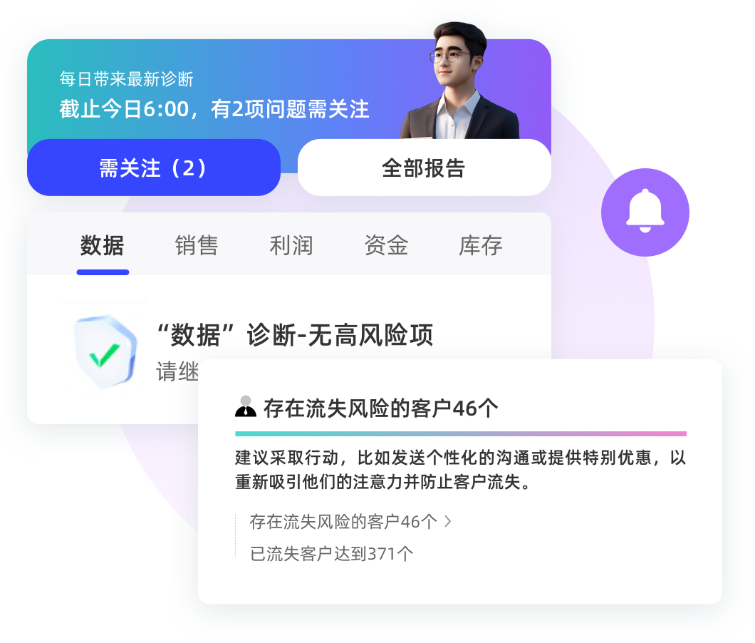 告别关键问题难发现,为您提供一名AI数据分析师,每日全面诊断经营数据,风险探必报
